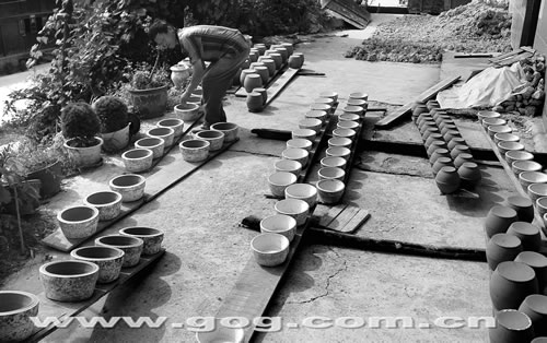 圖:村民金愛平在晾曬陶瓷產(chǎn)品。