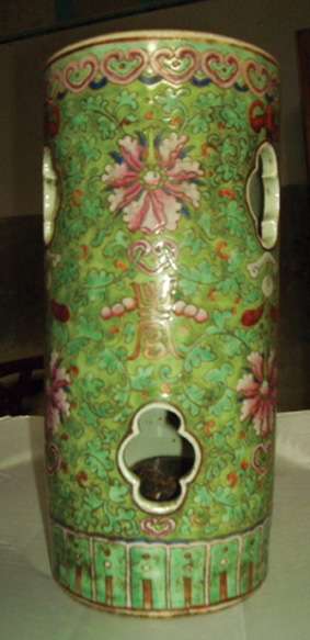 筆者家傳一款帽筒,它屬于粉彩開窗類的帽筒,是光緒初年晉商贈(zèng)送給筆者家中先輩的祝壽禮品。