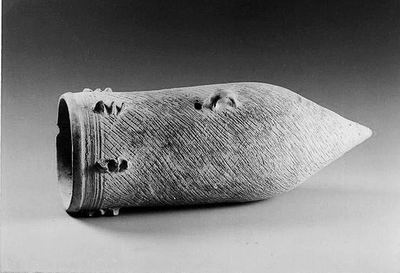 在我們發(fā)現(xiàn)這個(gè)尖底紅陶瓶時(shí),里面有幼小的人類尸骨。這件器物除實(shí)用外,口沿處蓋一鼎或盆可做葬具,這就是當(dāng)時(shí)流行的甕棺葬。據(jù)說,夭折的嬰孩放在此瓶中,埋在父母住處的房基下,寓意骨肉不分離,瓶身上的圓孔用來(lái)供靈魂自由出入。