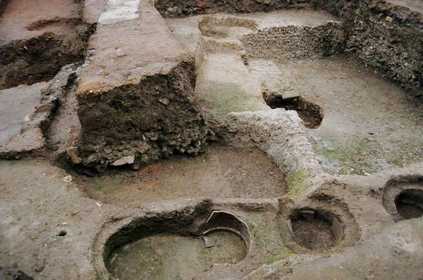清涼寺汝官窯遺址共分四個(gè)區(qū)域(用羅馬數(shù)字表示)。清涼寺村南臺(tái)地為Ⅰ區(qū),韓莊村為Ⅱ區(qū),小石橋西為Ⅲ區(qū),清涼寺村為Ⅳ區(qū)。天青釉中心燒造區(qū)位于Ⅳ區(qū)西北部。1987年至2001年經(jīng)過7次試掘和發(fā)掘,該遺址文化內(nèi)函十分豐富。地表窯具、瓷片俯拾皆是,民窯區(qū)地層堆積一般在2—3米左右,最厚處達(dá)6米以上。官窯區(qū)地層堆積0.25米至1.2米,最厚處近2米。發(fā)掘出的遺跡和遺物:民窯區(qū)主要遺跡有窯爐、窖藏、作坊、灰坑、排水溝、水井等遺跡。主要遺物有碗、盤、碟、盞托、盂、器蓋、三彩枕、爐、匣缽、支釘架、墊圈、印模等,同時(shí)出土的還有御用汝瓷鵝頸瓶、折肩瓶、細(xì)頸小口瓶、洗等。其產(chǎn)品類型有白釉、豆青釉和淡灰釉,黑釉和醬釉,鈞瓷、三彩等。官窯區(qū)主要遺跡有作坊、過濾池、澄泥池、窯爐、灰坑、水井、排水溝等。主要遺物有瓷器、模具、窯具三大類,還有少量錢幣。出土的瓷器據(jù)不完全統(tǒng)計(jì),天青釉汝瓷占99%。器種有碗、盤、碟、盞、盞托、器蓋、缽、洗、盆、套盒、瓶、爐、壺等。釉色以天青、淡天青、月白為主,青綠、淡青綠釉也占一定比例。出土的模具多為輪制,有花紋的刻制,花紋復(fù)雜的對(duì)合而成。分兩型。A型,皆輪制,B型,蓮花爐外模。出土的窯具有匣缽、支燒器座、試燒插餅、墊餅、墊圈等。出土的錢幣主要有“元豐通寶”和“元符通寶”兩種。文化層一般在2-3米左右,最厚處達(dá)6米, 可劃分為七層。