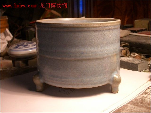 三期北宋晚期 官窯 宋哲宗天圣元年——宋徽宗崇寧五年 1086至1106年 20 造型莊重大方,品種豐富齊全,即有日常生活用品,又有工藝美術(shù)陳設(shè)品及文房四寶等。胎質(zhì)堅硬細(xì)密。呈香灰色,釉色瑩潤美觀,細(xì)小開片密布。底為支釘滿釉支燒,釉色天青,粉青,卵青,天藍(lán),月白等。