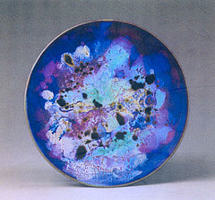 在釉色上,采用新的配料,燒制出以前沒有的顏色,使鈞瓷的色彩更加斑斕。有一件極品掛盤,上面呈現(xiàn)出七八種色彩,盤折曲繞,互相映襯,精美至極。