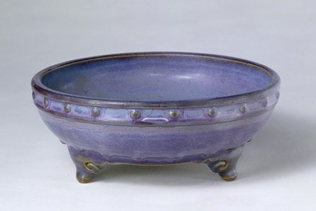 洗作鼓式,亦稱鼓式洗。器身上下飾鼓釘二周(上22枚,下18枚),其下承以三如意頭足。洗內(nèi)施天藍色釉,外為玫瑰紫色釉。底刷黃褐色薄釉,繞底一周有支燒痕,并刻有“一”字標記。河南禹縣鈞臺窯址曾發(fā)現(xiàn)刻有“一”至“十”數(shù)目字的鈞瓷標本,與故宮博物院收藏的官鈞窯瓷器相同,此類數(shù)目是同類制品從大到小的編號。