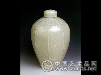 瓶有蓋,小卷口,短頸,上小下大,豐肩,腹作八棱形,短圈足,蓋頂部印一牡丹花,肩和脛部分別刻覆蓮和仰蓮紋。瓶腹八面模印花卉圖案,外施青白釉,稍泛黃色,瓶?jī)?nèi)和足無釉,胎灰白,紋飾刻印相結(jié)合,線條流暢清晰,造型俊美。