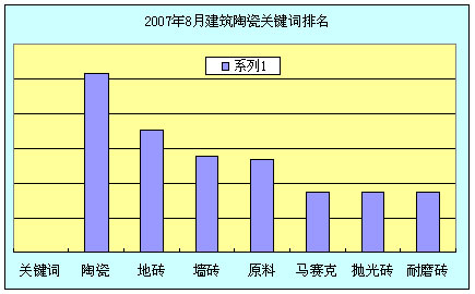 從8月份的關(guān)鍵詞排名可以看出,排在前列的依舊是墻地磚、馬賽克、原料、拋光磚和耐磨磚,這說明,無論環(huán)境如何變化,政策如何調(diào)整,整個市場的需求還是沒有太大變化,依舊是這些產(chǎn)品作為主打產(chǎn)品,活躍著整個陶瓷市場。