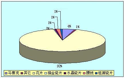 從這個圖中我們可以很清楚的看到,花片的供應量占據(jù)了整個建筑陶瓷產(chǎn)品的供應量的92%,其后依次是馬賽克、水晶瓷片、腰線和組畫瓷片,因此提醒廣大商友,對于花片這個市場,已經(jīng)出現(xiàn)很明顯的供大于求,所以生產(chǎn)或是銷售都需謹慎。