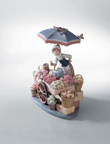 這件作品創(chuàng)作于1983年,是雅致相當(dāng)經(jīng)典的一件作品。一位小女孩在滿是花朵的花車(chē)旁留連忘返,花車(chē)頂上還停著幾只小鳥(niǎo),一派春機(jī)盎然的景象。這件作品極盡地表現(xiàn)了雅致經(jīng)典的花朵制藝,每一個(gè)花籃中都盛放著不同的花朵,形態(tài)、顏色各異,甚至連每個(gè)花籃也各不相同,各種材質(zhì)在陶瓷的雕琢下逼真展現(xiàn)。
