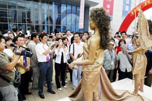 “去年我們是以淄博的陶瓷、蹴鞠、齊國(guó)故都、聊齋故里四張城市名片加上兩組前衛(wèi)的真人雕塑為素材做了六組真人雕塑。今年我們以世界風(fēng)情為主,古羅馬戰(zhàn)士、西班牙斗牛士、自由女神、希臘女神、哈姆雷特,加上時(shí)尚類的反恐精英,展現(xiàn)民族特色的老北京茶館群像等一共七組真人雕塑,表現(xiàn)淄博陶瓷正邁向國(guó)際化。”鄭小姐介紹說,真人雕塑將在本次陶博會(huì)上展示3天,每天上午和下午各兩個(gè)小時(shí)。