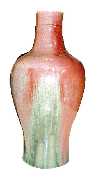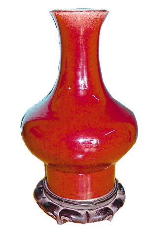 讀者葉先生在信中寫道:“本人祖輩留下一件紅釉花瓶,與2007年4月18日《廣州日報》梁國熹先生所提供的‘乾隆紅釉賞瓶’基本一樣,口徑10.5cm,足徑也是13.5cm,高34cm,(足高比梁國熹的瓶多2CM,釉色一樣),帶座。現(xiàn)想請專家對其進行鑒定,是否乾隆花瓶。”