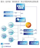 借著完全數(shù)字化的光纜寬帶網(wǎng)絡(luò)和遍布全球的網(wǎng)絡(luò)設(shè)備,“香港電訊”提供全套的本地及國際電訊服務(wù),包括固定和無線的話音服務(wù)、數(shù)據(jù)服務(wù)和租借線路,以及窄帶和寬帶的互聯(lián)網(wǎng)接入、交互式多媒體服務(wù)、傳呼臺(tái)、應(yīng)用軟件供應(yīng)和系統(tǒng)集成服務(wù)。它經(jīng)營著香港370多萬條固定線路。合并前,其公司架構(gòu)和業(yè)務(wù)如圖6所示。