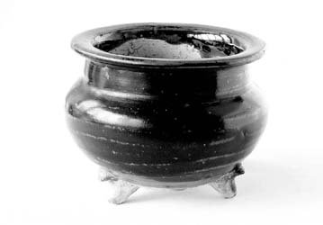 南宋吉州窯黑釉香爐高9厘米,直徑11厘米,爐口平沿外折,中腹微鼓,三只帶弓弧形矮足,露出胎體,底部為灰白色,上面有些粘貼得很緊的紅壤,雖經(jīng)沖刷但依舊保留著,可見此爐應(yīng)為出土之物了。爐身以黑釉為主色調(diào),黑釉施至底部,釉汁瑩潤,釉面光潔,器型規(guī)整,制作精細,別具雅趣。內(nèi)胎不施釉,拉坯痕跡明顯,刀法簡練,瓷土淘洗不夠精細,可以看到一些雜質(zhì),胎體略顯得粗松一點。