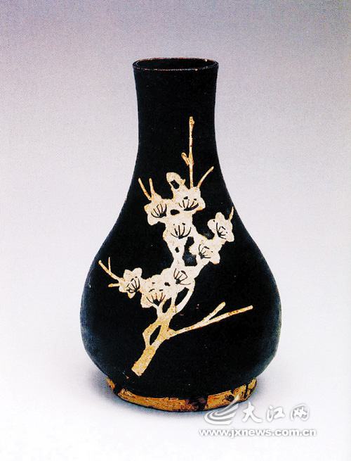 吉州窯剪紙貼花工藝創(chuàng)燒于南宋,大致有兩種方法:一種為單色剪紙,直接把剪紙紋樣貼于器物坯胎上,再施上一層釉,待釉干后剔掉剪紙紋樣,就得到釉色與胎色相對的圖案。另一種是雙色剪紙,是將剪紙紋樣直接貼在已上過含鐵量高的底釉器上,再薄施一層含鐵量低的石灰鈣型竹灰釉,然后剔掉剪紙紋樣,就顯出底色紋樣來,入窯高溫燒制,兩層釉變化出各種窯變色釉,底釉與面釉色彩既有細微的區(qū)別又和諧統(tǒng)一,釉色和胎色對比深淺相映、動靜相輔,在淺淡的底釉上呈現(xiàn)出深色的剪紙紋樣。