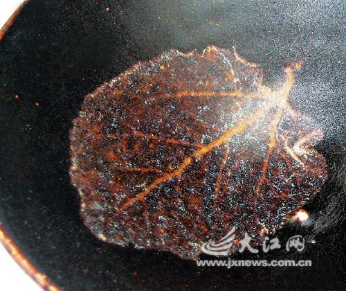 那是多么神奇的構(gòu)思啊!田野里的桑葉,柚葉,或烏桕子樹葉,被工匠們隨手采來一片兩片,有時甚至是半片帶卷的葉子,還有蟲眼呢,都被隨意地放在已施黑釉的斗笠碗坯中。高溫燒制后,金黃或紫褐的樹葉,恰似被一陣輕風吹過,飄落盞中,渾然天成,看上去與離開枝頭時一樣新鮮。漆黑的斗笠碗如扇面形深邃的夜空,金黃色的樹葉宛如明月,寧靜、素雅,簡單平常卻又明亮華貴,勾起人無限遐思。