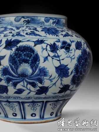 “此罐的夔耳做工極好,寬肩在底部逐漸變窄,帶有卷唇的瓶頸豎立在肩部之上。肩部用鈷藍(lán)繪著牡丹,有花蕊,花朵蜿蜒著,活靈活現(xiàn)。這六柄碩大的牡丹各自呈現(xiàn)出不同的角度,每朵花都有繁盛的花瓣,花瓣的尾部呈葉狀,脈絡(luò)雕刻得很清晰。其中三朵花展示的是側(cè)面,它們的花瓣有開有合,中間的雄蕊就被展現(xiàn)出來了。其他的幾朵分別呈現(xiàn)出花的上部和底部,它們的花瓣長在波浪般起伏的粗莖上,規(guī)則地圍繞著中間的花結(jié)(六片突出的花萼),花莖上長著豐滿的尖葉和不同程度開放的小花蕾。在罐的肩部,還有蜿蜒的荷花長在曲折的莖上,它們有著正統(tǒng)形狀的花朵和長而尖的卷葉,尖的花瓣交替張合,我們可以從中看到花心,花的上面,有一段白色浪尖延伸到短頸上的波紋,和一道細(xì)窄的經(jīng)典卷形緣飾,以及風(fēng)格化的豎直垂片,這些都處在雙線的緣飾中,圍繞著底部上方云朵般三葉形和環(huán)形的垂飾。這個設(shè)計用細(xì)致的觸、豐富的藍(lán)紫調(diào)的鈷藍(lán),通過強(qiáng)調(diào)起伏,在內(nèi)部運(yùn)用藍(lán)色調(diào)的釉,底部和底緣不上釉來展現(xiàn)其上好的本色陶,巧妙地表現(xiàn)出了博大的氣氛”… Regina Krahl (世界著名陶瓷專家)寫道。