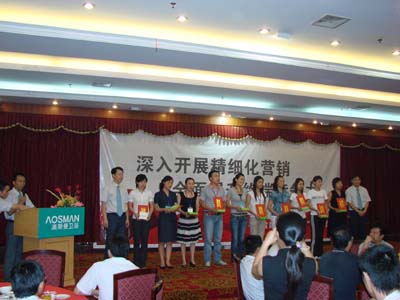 澳斯曼南區(qū)銷售總監(jiān)韓經(jīng)理(右一)及北區(qū)銷售總監(jiān)帥經(jīng)理(左一)為優(yōu)秀店長頒獎(jiǎng)