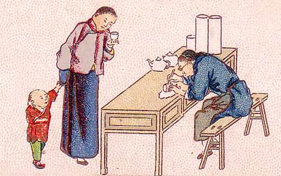 這是一幅清末出品的煙畫,畫上刻瓷師傅正在依照顧客的要求,