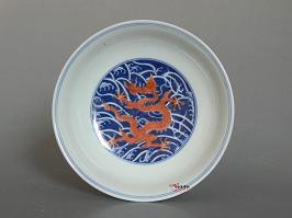 清乾隆 景德鎮(zhèn)官窯青花加紅彩海水龍紋盤(pán)