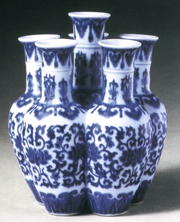 高17厘米、口徑3.1厘米、足徑3厘米。瓶敞口,長(zhǎng)頸,頸部凸起一周,圓肩,圓腹下垂,圈足。足內(nèi)白釉泛青,有青花“乾隆年制”四字篆書款。六個(gè)小瓶瓶體緊密相連,中間小瓶略高。口沿繪嬰絡(luò)如意紋,肩部繪下垂如意頭和纓絡(luò)紋,腹部滿繪纏枝蓮花,近底處繪海水蕉葉紋。造型新穎別致,青花濃重艷麗并有暈散。