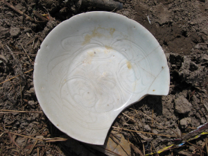這些陶瓷殘器和碎片,有碗、盤、碟、盞等,精粗不一,釉色和器型各異,精細(xì)的胎質(zhì)細(xì)膩,還有劃花裝飾,有的底下有墨書的字符,以精細(xì)的占多數(shù)。蔡昌振在仔細(xì)翻檢觀看后認(rèn)為,陶瓷殘器和碎片確實(shí)是宋代的,大多為北宋時期。且從精細(xì)程度看,這些瓷器并非本地生產(chǎn),而是出自北方及福建等地,在當(dāng)時,普通人家是用不起的,應(yīng)為官宦人家所用。
