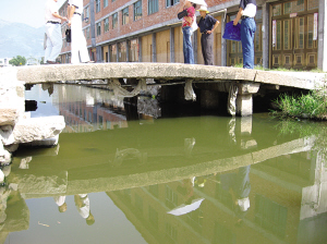 毛昌逵說:古時候,鰲江自蓋竹村前經(jīng)過。自鰲江上岸,走過虹橋,就進(jìn)入了蓋竹。如今虹橋還在,只是改成了可通汽車的鋼筋水泥橋了,橋前方的鰲江更是大幅度地改道南移。毛昌逵說,在解放后平整土地時,他們挖到了街區(qū)的遺址,規(guī)模這么大,想當(dāng)年這里應(yīng)該十分繁華。