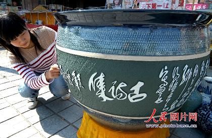 10月8日,一口需要5個(gè)大人才能抬動,標(biāo)價(jià)36萬元的天下第一缸,在江蘇連云港市新浦隴海步行街對外展示。 據(jù)悉,這口大缸是由江西景德鎮(zhèn)老五瓷廠高級工藝師設(shè)計(jì)燒制,高80公分、直徑95公分,采用多種工藝燒制而成,缸體色澤鮮亮,刻有草書詩詞,讓觀者看后嘖嘖稱絕。
