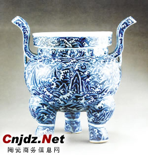 青花瓷一般都是白底藍(lán)花,而青花壽山福海紋爐作為官窯大器,不吝材料,以費(fèi)料費(fèi)時(shí)的十分少見的藍(lán)底白花來表現(xiàn),器物外壁,滿繪洶涌波濤,并在下腹部加繪山巒疊嶂,寓壽山福海之意。青花壽山福海紋爐的外壁用蘇泥勃青料繪畫,這是一種名貴的進(jìn)口青料,其中含有一些鐵質(zhì),由于用料比較濃厚,瓷胎比較軟,所以繪畫時(shí)會將胎粉帶起,而青料浸到胎中,燒成之后的青花,手摸有凹凸感,顯得深沉典雅,入瓷三分。站在展廳的獨(dú)立柜前,轉(zhuǎn)換不同的角度欣賞青花壽山福海紋爐,會發(fā)現(xiàn)它在燈光下,滿身的青花,閃著金屬的光澤;滿爐的波濤氣勢磅礴,似乎將要涌出。海水中的山峰,渲染出壽山福海的氣勢,美好的祝福在觀者心中激蕩。