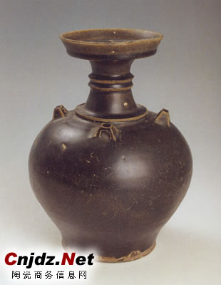 東晉,黑瓷盤口壺,上海博物館藏,高24.9厘米。此器極為珍貴,盤口、弦文、橋形系等都是明確的斷代標(biāo)志另外它證實了中國黑釉陶瓷產(chǎn)品的成熟期最晚不過四世紀(jì)。