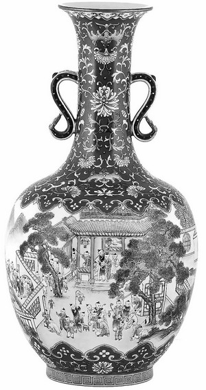 乾隆時期的粉彩有如下特點:1.乾隆粉彩利用粉彩粉潤柔和的質(zhì)感,用粉化的各種彩料仿制各種工藝品,能準(zhǔn)確地表現(xiàn)出所仿之物的色彩和質(zhì)感,可謂惟妙惟肖。2.乾隆粉彩有一個獨有的特征,即器物口部及底部都施松石綠釉。松石綠釉非常淺淡光潤,釉面猶如粥皮,由于是一種低溫彩釉,釉面常常帶有細(xì)小的紋片。3.乾隆官窯粉彩的紋飾一般是“大內(nèi)”送來的圖樣,主題紋飾按不同時節(jié)都有嚴(yán)格規(guī)定,主紋是纏枝花,分別加施變龍、變鳳、蝙蝠或纓絡(luò)、八吉祥等,組成各種祥瑞吉慶、美意延年內(nèi)容的圖案。4.乾隆粉彩的造型工藝更是精益求精,不論是高達一米多的大型陳設(shè)瓷,還是小至幾厘米的扳指兒、鼻煙壺,造型都非常規(guī)整,很少出現(xiàn)夾扁或歪塌現(xiàn)象。 此件清乾隆粉彩春燈嬰戲雙耳瓶為乾隆粉彩的代表作品,無論從色彩、器形、工藝上都有很大的特點,尤其在文化內(nèi)涵上更是反映了封建帝王希望“百子千孫”、“江山永固”的思想。同時也反映了千百年來勞動人民盼望有子傳宗接代的良好愿望。此瓶細(xì)長頸,撇口,耳作如意形,喻“平安如意”,碩腹,平底,矮圈足,口及耳描金,頸至肩及腹底以如意云頭為邊,在紅地上畫纏枝番蓮間飾蝙蝠。腹部彩繪高山流水,庭舍樓臺,配以樹石花草,眾嬰孩嬉戲其間,或舞龍或提燈,足邊描回紋,器內(nèi)及底均施湖綠色釉,底描紅書“大清乾隆年制”六字篆款。