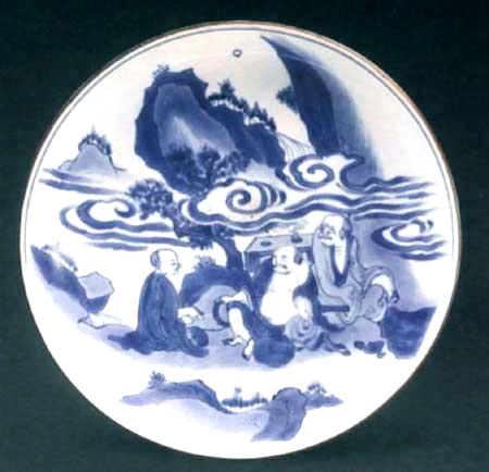 盤敞口,口沿施醬釉,弧壁,圈足略高,足內(nèi)青花寫有“玉堂佳器”四字楷書款。口沿薄至底部逐漸增厚,白釉泛青,青花艷麗,外壁光素?zé)o紋,盤內(nèi)繪三個(gè)老和尚席地而坐,一和尚手拿樹葉,一和尚手拿佛珠,另一和尚手拿撲扇,身前立一老虎,人物周圍襯以山石、松樹、花草紋,空中繪流云、月亮,人物姿態(tài)各異,形象生動(dòng)逼真,構(gòu)圖新穎別致。