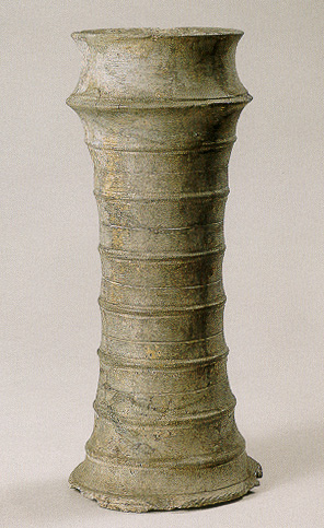 此瓶高23.8厘米,口徑8.6厘米,泥質(zhì)灰陶。侈口,凸肩,凹弧形腹,下有三個(gè)扁方形矮足。器身飾竹節(jié)形凸棱七周,宛如一段竹節(jié),簡(jiǎn)潔明快。