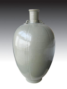 晚唐詩(shī)人陸龜蒙在《秘色越器詩(shī)》中贊美越窯瓷器的釉色為:“九秋風(fēng)露越窯開(kāi),奪得千峰翠色來(lái)”。越瓷的釉色以青為主,青中帶灰,形成特有的“艾葉色”,晶瑩潤(rùn)澤。越窯創(chuàng)燒于唐朝至五代時(shí)期,燒制技術(shù)至宋朝已達(dá)到爐火純青的地步了。 在當(dāng)時(shí)的吳越一帶,即現(xiàn)在浙江的余姚、上虞、諸暨等地出現(xiàn)了大量的越窯古窯址,這表明了盛唐政治安定,經(jīng)濟(jì)繁榮,制瓷業(yè)興盛。從五代 公元907 960年 起,制瓷業(yè)開(kāi)始設(shè)立“御窯”即“官窯”,產(chǎn)品專(zhuān)供宮廷使用,越窯瓷器作為御用的也稱(chēng)為秘色瓷,宋人曾慥《高齋漫錄》說(shuō):“吳越秘色窯,越州燒進(jìn),為供奉之物,臣庶不得用,故云秘色”。秘色實(shí)即還原焰經(jīng)1300℃高溫?zé)傻,釉色即所謂艾青、湖綠、翠青的“千峰翠”色。 本件藏品是一件五代越窯瓜棱云紋雙系梅瓶,瓶高31厘米。梅瓶是古代的儲(chǔ)酒器,釉色為典型的艾青色,通體施釉,圈足支燒,底部陰刻“內(nèi)”字(見(jiàn)圖),可見(jiàn)這件作品是當(dāng)時(shí)供“內(nèi)府”使用的官窯器。整件梅瓶刻有六條瓜棱線(xiàn),并在瓶體上以本色釉劃刻六朵飄帶立云紋,瓶肩部塑二圓孔,便于穿繩系帶,瓶口外卷,亭亭玉立,美不勝收。五代梅瓶與后世梅瓶稍有不同的是口頸稍長(zhǎng)、肩腹較寬,并帶有雙系,這是梅瓶初創(chuàng)時(shí)期的特征,不過(guò)那時(shí)這種作為酒具的窯器,不稱(chēng)梅瓶,而叫酒經(jīng)、經(jīng)瓶,至晚清“梅瓶”稱(chēng)謂才出現(xiàn),因其小口僅能容納一枝梅而得名。 2005年,紐約蘇富比拍賣(mài)公司秋拍,曾以46.04萬(wàn)美元,拍出了一件器高39厘米的五代越窯刻花帶蓋梅瓶,得主是臺(tái)灣私人收藏家,刻花圖案也是飄帶立云紋。由此可見(jiàn)梅瓶因其精湛的工藝以及獨(dú)特的人文價(jià)值,給人以極高的藝術(shù)享受,是收藏拍賣(mài)市場(chǎng)的寵兒。