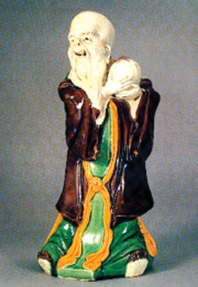 壽星,是民間傳說中主宰人間壽夭之神,即南極老人星。在古代,壽星的地位極為崇高,《尚書》說:“(人有)五福,一曰壽,二曰富,三曰康寧,四曰攸好德,五曰考終命”———五福中“壽”排在首位,可見人類對長壽的追求是亙古不變的。自東漢起,祭祀壽星與敬老活動結(jié)合在了一起,列入歷朝歷代的祭典,并由帝王親自主持祭祀儀式,直到明代洪武年間才廢除。但此后,民間對壽星的崇拜卻更為普遍了。 自有壽星崇拜以來,其形象有一個逐漸演變發(fā)展的過程,到清代已基本定型。河北省博物館藏有一件清康熙年間的素三彩“壽星捧桃瓷像”,就是一位天庭飽滿、鶴發(fā)童顏的古裝老者,手捧鮮桃,含笑而立,那慈祥和藹的面容,令人感覺可親可敬……由此可見,銀發(fā)長須、頭高額隆、大耳短軀、面目慈祥———凡此種種形象特點(diǎn),于壽星而言是缺一不可的。素三彩,是一種極為珍貴的釉上彩瓷器品種。這種工藝始創(chuàng)于明成化年間,到清康熙時已日臻成熟。 這個時期景德鎮(zhèn)的素三彩瓷器極負(fù)盛名,是素三彩制品最為精致的時代。素三彩常見的顏色有黃、綠、紫,其制作方法是在高溫?zé)傻乃靥ド嫌貌视蕴钤谝芽虅澓玫募y樣內(nèi),再經(jīng)低溫?zé),因顏色中沒有紅色等鮮艷色彩,顯得素凈、淡雅,故名“素三彩”。當(dāng)然,“三”在文言中有“多”的含義,所以素三彩并不限于黃、綠、紫三種顏色,譬如這件“壽星捧桃瓷像”中,壽星的內(nèi)衣為綠色,飄帶為黃色,外衣和靴子則是施以褐色釉。在此,黃、綠、褐雖皆為素色,但釉色卻很鮮艷,因此并不給人以沉悶濃重之感。