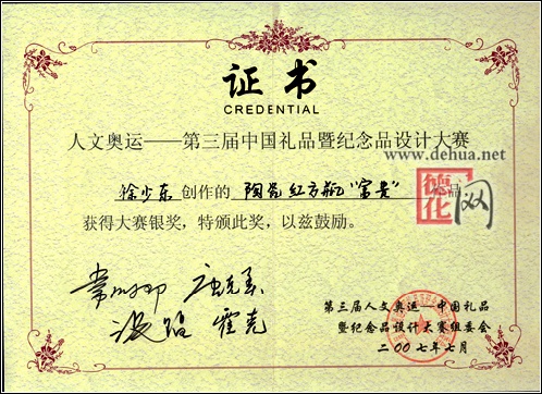 日前,人文奧運——第三屆中國禮品暨旅游紀(jì)念品設(shè)計大賽落下帷幕,來自中國瓷都——福建德化縣的富貴紅名瓷“富貴”方瓶獲大賽銀獎。