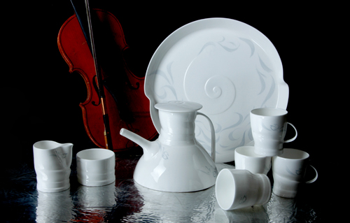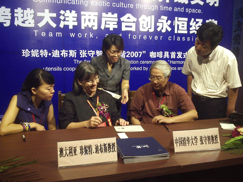 這套冠名為“和諧2007”的咖啡具,其造型由世界著名十大陶藝家之一、澳大利亞國立大學(xué)藝術(shù)系主任珍妮特?迪布斯設(shè)計(jì),畫面裝飾則由被譽(yù)為中國瓷藝泰斗的清華大學(xué)工藝美術(shù)學(xué)院教授張守智創(chuàng)意。他們歷時一年半的切磋和磨合,在淄博華光瓷業(yè)有限公司的鼎力配合協(xié)助下順利完成。該作品全球限量發(fā)行200套,將被中國國家博物館、中國工藝美術(shù)館、澳大利亞國立美術(shù)館、中國陶瓷館收藏。