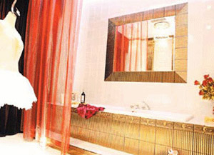 頭上是璀璨的斯華洛世奇水晶吊燈,腳邊環(huán)繞著范思哲的粉色瓷磚,眼前是造型纖巧圓潤(rùn)的潔具,舉手可以把鎦金玻璃花瓶;而變色龍式的酒紅落地幔紗,紅黃綠白紫七彩交錯(cuò),螺旋形水晶燈更將簡(jiǎn)單的浪漫單符彈奏成一首立體的幻想曲。