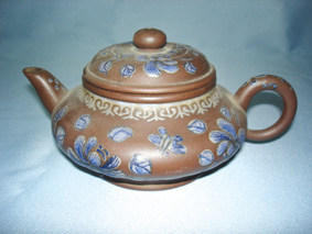 扁燈式紫砂壺,在清代中期非常盛行,主要由于它式樣高雅端莊,飲用時捧在手中玩賞(俗稱上手)能顯示主人的品位,而常受到京城皇族后裔、文人及八旗子弟的青睞。     此壺通高9厘米,工藝傳統(tǒng)規(guī)范,壺身鼓腹扁圓,圈把,短嘴獨孔,蓋和鈕亦是扁圓形,成為壺的整體。此壺通高9厘米,工藝規(guī)范,壺身鼓腹扁圓,圈把,短嘴獨孔,蓋和鈕亦是扁圓,形成壺的整體。