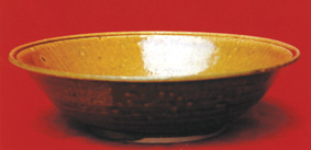閩北私人收藏的一只五代醬黃釉唇口大碗 見圖 ,高5.8厘米,口徑20厘米,足徑10厘米,造型顯得寬矮、規(guī)整、輕巧,厚唇,口沿外翻,碗壁略顯斜直,胎壁較薄,寬矮圈足,見堅(jiān)致的灰白色胎,碗內(nèi)壁底見圓形澀圈無釉,而澀圈內(nèi)中心有釉;圈足及足端無釉,而圈足內(nèi)又滿釉,并見弦刷釉痕。內(nèi)外壁均施滿醬黃色釉,開細(xì)小冰裂紋。碗外壁見施釉不勻之縮釉點(diǎn),釉薄處可見壁上的輪制弦削痕以及近底足處的竹片刮削痕。