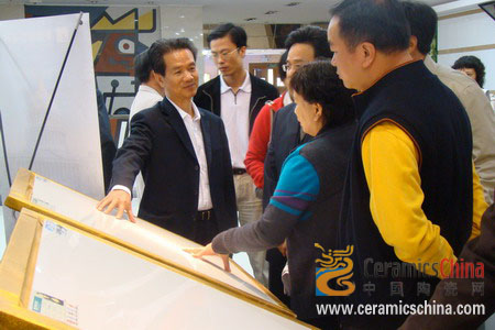 蕭華董事長向陳勝才等領(lǐng)導介紹最新研發(fā)的瓷質(zhì)薄板產(chǎn)品