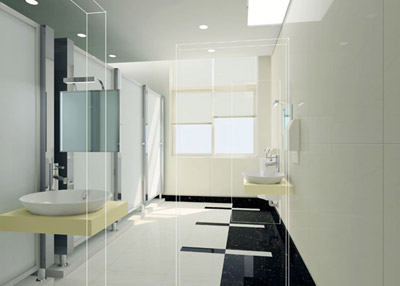 客衛(wèi)采用了暖氣片的取暖方式,為了讓浴室里充滿著溫馨,設(shè)計師在色彩和燈光上也下了功夫,屋頂上方模擬了一扇別墅才有的“天窗”,燈光從天藍色的冰裂玻璃中透出,讓人仿佛隨時都能與藍天、白云對話的感覺。而墻面鋪設(shè)的米黃色的瓷磚,則傳遞陣陣暖意。