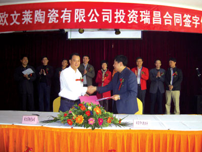 11月21日上午,在佛山陶瓷行業(yè)協(xié)會(huì)秘書長(zhǎng)尹虹等人的見證下,佛山歐文萊陶瓷董事長(zhǎng)梁偉鴻與江西省九江瑞昌市政府簽訂了一份投資金額達(dá)10個(gè)億的協(xié)議,確定在瑞昌市碼頭工業(yè)區(qū)新型建材工業(yè)基地圈地1080畝,并規(guī)劃上12條生產(chǎn)線,成為落戶該基地的第一家企業(yè)。作為江西省繼高安、豐城、景德鎮(zhèn)等幾家在建陶瓷基地之后的又一個(gè)新辟陶瓷基地,瑞昌市也開始進(jìn)入佛山陶企外遷的視線中來。