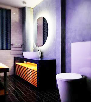 冷調(diào)的粉紫是調(diào)情的高手,手工刺繡的雛菊圖案在紫紗上若隱若現(xiàn),給沉悶的衛(wèi)浴帶來遐想,沉醉在這明艷的色調(diào)中,享受全身心的放松吧!來點(diǎn)綠植,大片的綠葉豐富了黑色瓷磚的層次,給浴室?guī)砹藷o限的生機(jī)。