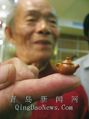 11月25日,在廣州舉行的2007中國國際茶業(yè)博覽會上,廣東著名陶瓷藝術家吳瑞深老先生展示他制作的重量僅1.4克的潮州手拉朱泥壺。