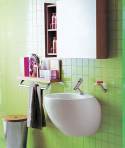 鮮艷的顏色總是讓人眼前一亮,翠綠的墻磚、地磚突出了衛(wèi)生間設(shè)計的活力與熱情。橢圓的白色潔具、不銹鋼的龍頭、皂托,表明了時尚與前衛(wèi)。