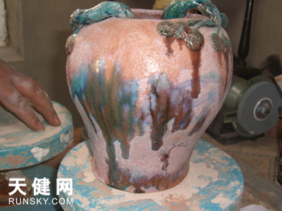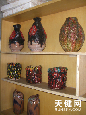 現(xiàn)在,在旅順乃至大連,完全用當(dāng)?shù)氐奶胀梁陀粤蟻頍铺掌鞯闹挥欣钣来阂蝗。?dāng)初,因為沒錢到購進(jìn)陶土李永春只能在家鄉(xiāng)的土地上去找,在歷盡艱辛之后,他竟發(fā)現(xiàn)自己的家鄉(xiāng)原來就是個出產(chǎn)陶土和釉料的聚寶盆,“要是這樣還燒不出好陶器來豈不愧對家鄉(xiāng)的泥土”,一個大膽的想法在李永春的腦中清晰起來。“我特別喜歡張大千的繪畫,就尋思像他那樣潑墨流淌成色彩,能不能產(chǎn)生出一種釉料來。” 用潑釉來燒制具有張大千潑彩國畫風(fēng)格的陶藝,據(jù)說這是個在陶藝史上從來沒有過的創(chuàng)新,為這李永春飽嘗失敗的滋味。“燒結(jié)要經(jīng)過一個漫長的過程,一旦陶器有疵點,真是窩火得受不。”