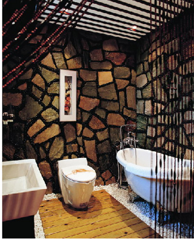 這種浴室中有的連天花板和墻面都飾以原木,木質(zhì)以涂清油為主,透出原木特有的木結(jié)構(gòu)和紋理,局部墻面用粗獷的毛石或大理石同原木相配,用石材特有的粗獷紋理打破木材略顯細(xì)膩和單薄的風(fēng)格,一粗一細(xì)既產(chǎn)生對(duì)比,又營(yíng)造出十足的不飾雕琢感。