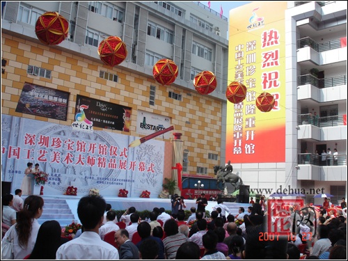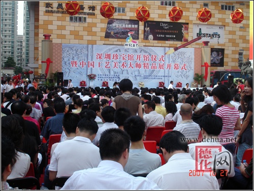 【德化網(wǎng) 訊】精美絕倫的刺繡珍品、巧奪天工的名窯陶瓷德化富貴紅,深圳市首個國家級的工藝品展示交易平臺——深圳珍寶館在福田區(qū)世紀工藝品文化廣場開館,中國工藝美術(shù)大師精品展也同時揭幕。市委常委、副市長呂銳鋒等出席了開館儀式。