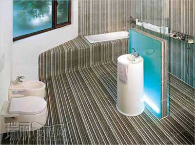 一眼看上去,整個(gè)浴室給人以個(gè)性而前衛(wèi)的第一感覺,這恐怕要?dú)w功于一件件如同個(gè)性符號(hào)般的潔具、大面積鋪貼能夠形成條紋效果的馬賽克、在洗面盆前設(shè)立矮墻及用燈襯托等有新意的物品和裝修方法。