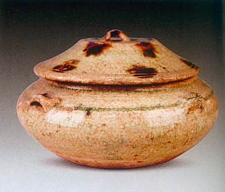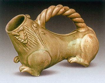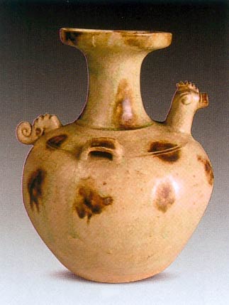 甌窯青瓷不但以釉色取勝,而且在造型上也有別于其他窯口,如鎮(zhèn)江市跑馬山東晉墓出土的青釉褐斑雞首壺,為淺盤(pán)口,雞首高昂,壺?zé)o把手,在雞首的對(duì)應(yīng)處,堆貼蠕體卷曲的尾飾。東晉時(shí)期墓葬出土的雞首壺一般都有把手,而此件卻別出心裁地堆貼出輕巧優(yōu)美的尾飾,從呆板的形態(tài)總"跳"了出來(lái)增添了活力和動(dòng)感(圖1)。東晉時(shí)期青瓷盤(pán)口壺肩部一般設(shè)有雙系、四系、六系等,而鎮(zhèn)江市陽(yáng)彭山磚瓦廠出土的一件東晉青釉八系盤(pán)口壺,肩部設(shè)有6個(gè)橋形系,在盤(pán)口沿內(nèi)又設(shè)雙系,使穿繩懸提時(shí)更加穩(wěn)當(dāng),融實(shí)用和美學(xué)于一體,更顯示出器形的曲線美(圖2)。六朝墓葬中出土的青瓷虎子較多,器形大同小異。而鎮(zhèn)江博物館藏南朝時(shí)期的青釉虎子,造型奇特,虎子前身大而聳峙,腰部收小,前后腿部微鼓,四爪翹起,顯得矯健有力;在頭的側(cè)面貼塑刻劃出牙齒、眼睛,使得抽象與寫(xiě)實(shí)相結(jié)合,這不能說(shuō)是一種創(chuàng)新(圖3)。大港南朝墓出土的青釉四系蓋罐,其蓋鈕打破了環(huán)形、橋形鈕的慣例,而做成方形,并在四邊中間設(shè)有凹槽,這種設(shè)計(jì),是為了使繩索通過(guò)凹槽穿過(guò)罐身的系扎牢而不晃動(dòng),構(gòu)思巧妙(圖4)。上述甌窯青瓷獨(dú)特的造型,表現(xiàn)出甌窯工匠豐富的想象力和精湛的造型技巧。