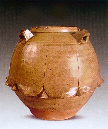 南朝時(shí)期,隨著佛教的盛行,作為佛教的象征物蓮花已成為瓷器上常采用的裝飾題材。鎮(zhèn)江博物館藏南朝青釉蓮花罐,在罐腹下部刻劃出一層覆蓮瓣,蓮瓣邊緣凸起,蓮瓣尖端略微上卷,成浮雕狀(圖6)。甌窯褐彩裝飾應(yīng)為釉下彩繪,釉下彩繪是指在胎體上彩繪后施釉,經(jīng)高溫一次燒成。從鎮(zhèn)江出土的甌窯青瓷褐彩中可以看出,褐彩緊貼于胎,青釉罩在褐彩上面。釉下彩繪的出現(xiàn),為唐代長(zhǎng)沙窯釉下彩繪的發(fā)展開(kāi)辟了道路。