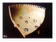 唐鈷藍(lán)點(diǎn)彩梅花紋飾殘片(圖4)。殘片大約是原碗的五分之二,有天有地,據(jù)此可推算出原碗的大。焊6.5厘米,口徑15.5厘米,足徑9厘米。敞口、鼓腹、圈足。胎色泛黃?谘匾遭捤{(lán)點(diǎn)彩,呈帶狀;碗心以鈷藍(lán)點(diǎn)為瓣,棕黃色點(diǎn)為蕊,組成梅花狀紋飾。鈷藍(lán)成色青藍(lán),暈散。